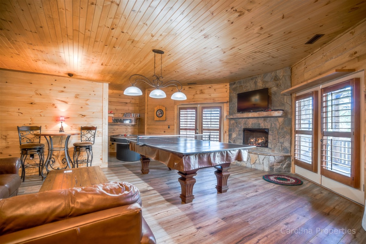 The lower level at The Bears Castle was designed with fun and convenience in mind! Here, you'll find a full bathroom, a laundry room, and a second kitchen complete with a refrigerator, stove, microwave, and sink. This level has a bunk room to accommodate your sleeping needs: one full, one twin, and two queen beds. There is also a semi-private queen bedroom (open at ceiling level). Ready for some competition? Try out the six-person air hockey table, pool table, ping pong table, skeet ball, and pinball machine before relaxing on the wrap-around deck. The beautiful fireplace and a flat-screen TV seal the deal to make this your one-stop shop for destination "fun!".